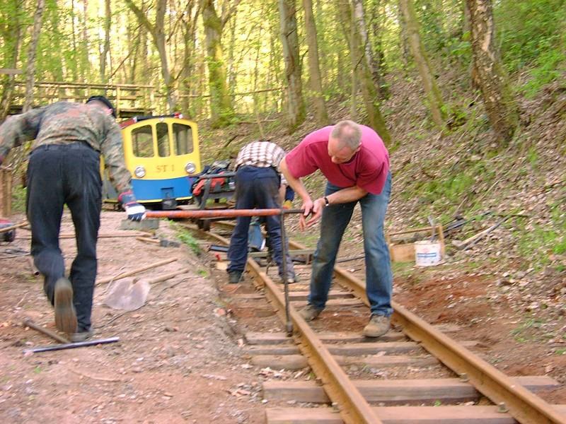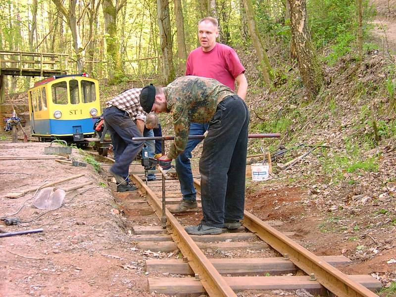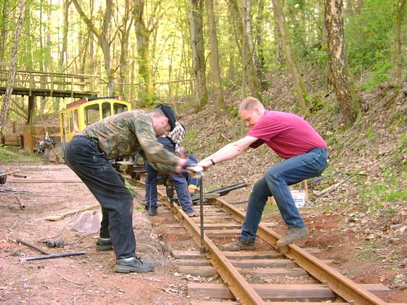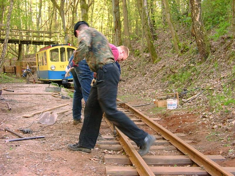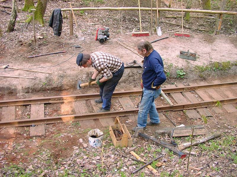 Das führte hier allerdings auch dazu, dass sich die alten Schwellennägel durch die Schrumpfung der trocknenden Schwellen gelockert hatten, so dass wir hier jetzt die Schienen mit den Schwellen verschrauben müssen.