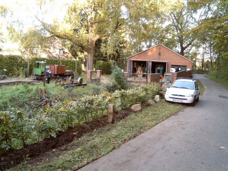 Am 13.Oktober sind Heiko und Natalie mal wieder zum Arbeitseinsatz zur Buchhorster Waldbahn gefahren. Hier gab es jede Menge zu tun, besonders der Grünschnitt wurde mal Zeit, denn im recht regnerischem Sommer wuchsen Gräser und Büsche wie Unkraut. Die Aussenhecke musste als erstes dran glauben und sie sieht nun wieder nach einer Hecke aus:-) Die Hofeinfahrt wurde dann noch begradigt, da sich die Wassermassen einen schönen Weg genau aufs Gelände der BWB gespült hatten. In zukünftiger Planung ist, ein neues Tor zu bauen, welches unten das Wasser wegleitende Bleche montiert hat, denn falls mal wieder einer der Fischteiche ’nen Dammbruch haben sollte, wäre es von Vorteil wenn diese Wassermassen dann am Tor vorbei die Mauer entlang geleitet werden und nicht das Gelände des Lokschuppens wieder überfluten.